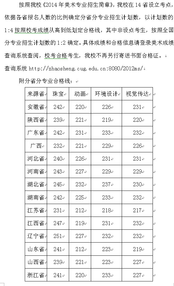 中國地質(zhì)大學(武漢)2014年美術(shù)類專業(yè)合格分數(shù)線