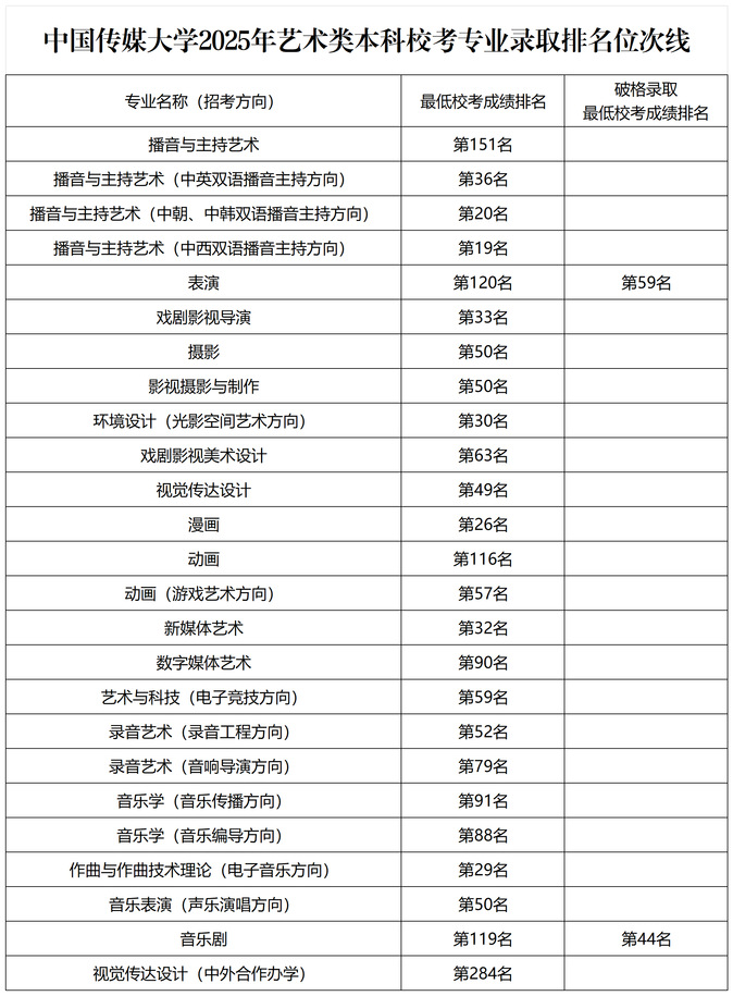 中國(guó)傳媒大學(xué)2025年藝術(shù)類本科?紝I(yè)錄取排名位次線